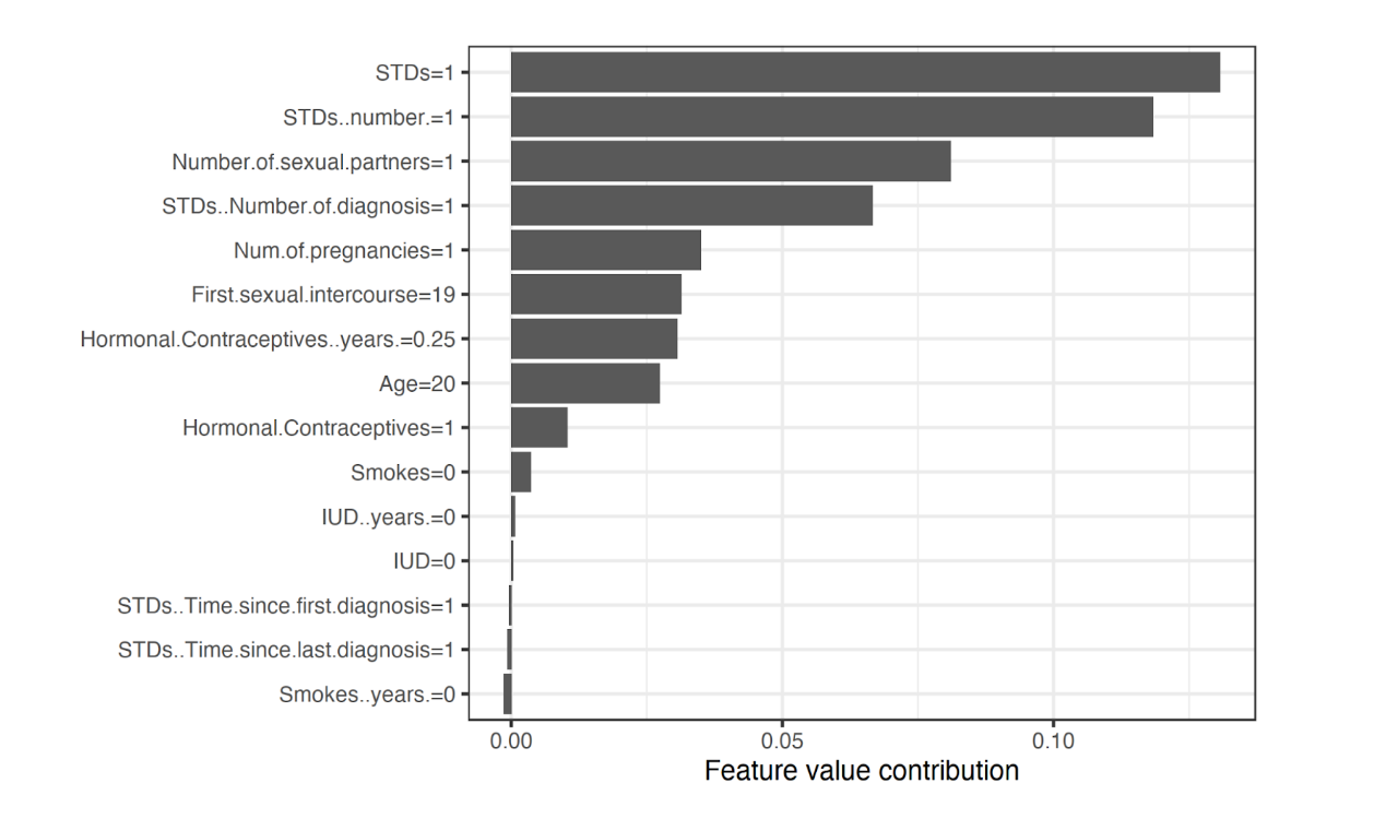 A more complex technique borrowed from game theory is a feature relevance approach that computes Shapley values, which describe the relative importance of each model feature on the output prediction. Figure 1 shows Shapley values from a random forest model that predicts cervical cancer risk trained on a University of California, Irvine Machine Learning Repository dataset. According to this analysis, features such as the number of diagnosed STDs and number of sexual partners appeared to increase cervical cancer risk the most (i.e. greater feature value contribution). This technique is model-agnostic as Shapley values do not rely on the nature of the model that it is attempting to explain, a noteworthy goal for all XAI techniques.