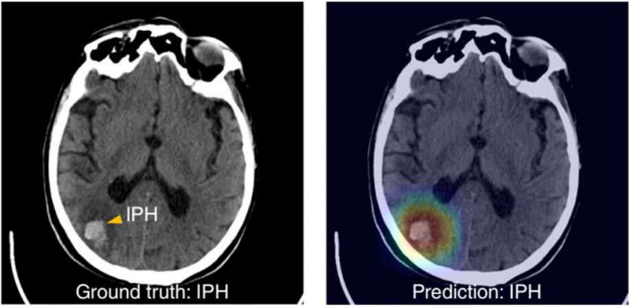 XAI can be applied to computer vision predictions as well. Figure 2 shows how a deep learning model has correctly predicted a patient to have intraparenchymal hemorrhage (IPH), or bleeding within the functional tissue of the brain (Lee, et al.). Gradient-weighted Class Activation Mapping (Grad-CAM) was then used to produce an overlaid heat map to identify which aspects of the image were relevant for making this prediction of IPH, with the color red signifying greater relevance.